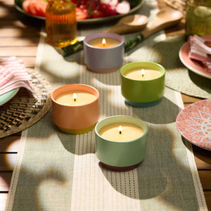 The invigorating blend of freshly picked garden mint, aromatic basil, sweet fennel, and citronella creates a rejuvenating ambiance perfect for open-air relaxation. Designed to bring the best of nature's freshness to your outdoor gatherings, this candle combines beauty and functionality for a delightful aromatic experience. Elevate your outdoor spaces with a refreshing scent in this ceramic jar candle, featuring citronella fragrance in white wax and a stylish two-toned jar design.